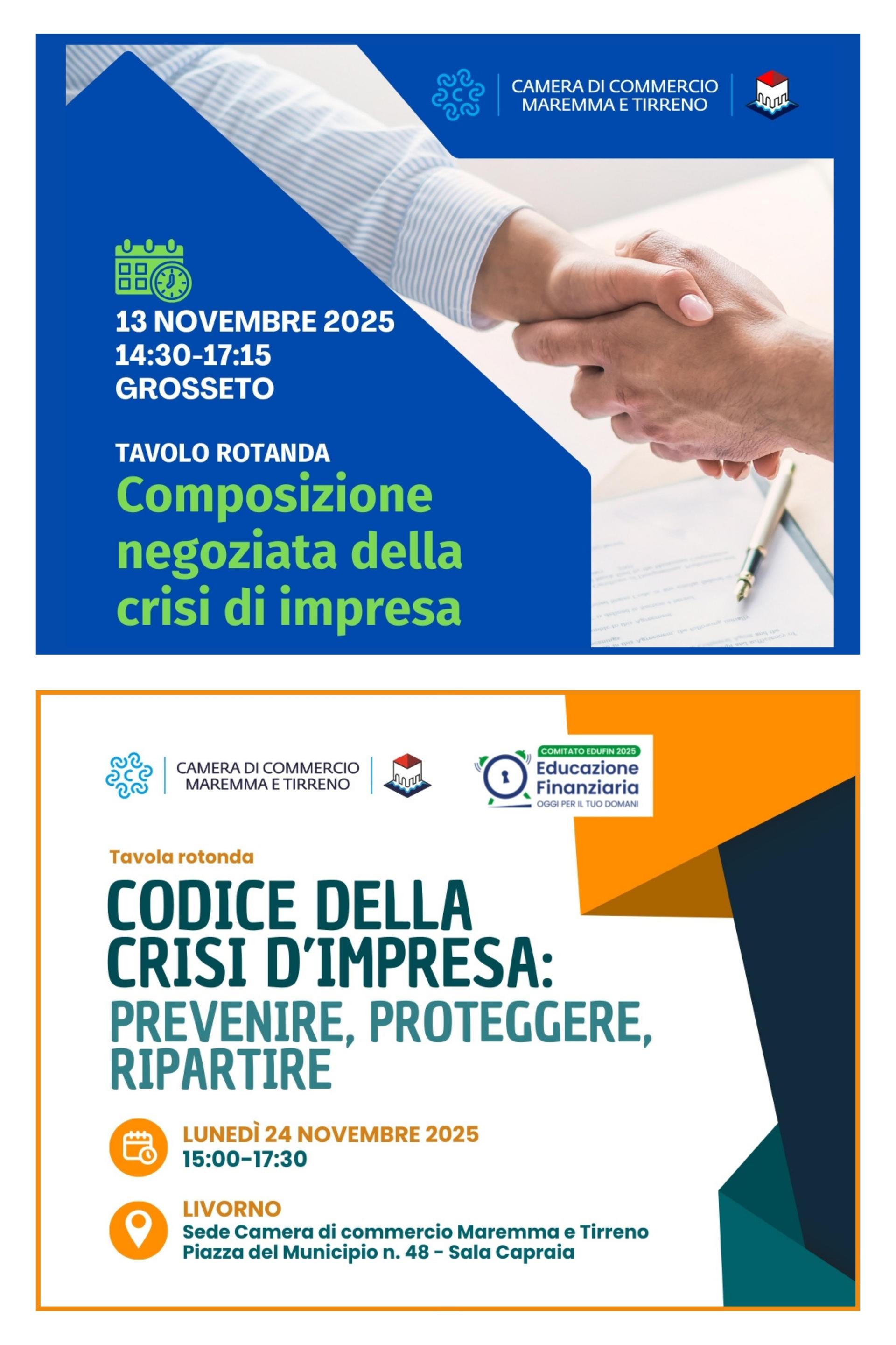 Il Codice della crisi d’impresa sarà invece al centro della tavola rotonda in programma il 24 novembre dalle ore 15 alle 17.30 nella sala Capraia della sede camerale di Livorno, in piazza del Municipio n. 48. L’appuntamento, gratuito e aperto a tutti, è inserito nel Mese dell’Educazione Finanziaria 2025, evento ministeriale nazionale che prevede un ampio programma sulla gestione e programmazione delle risorse finanziarie.