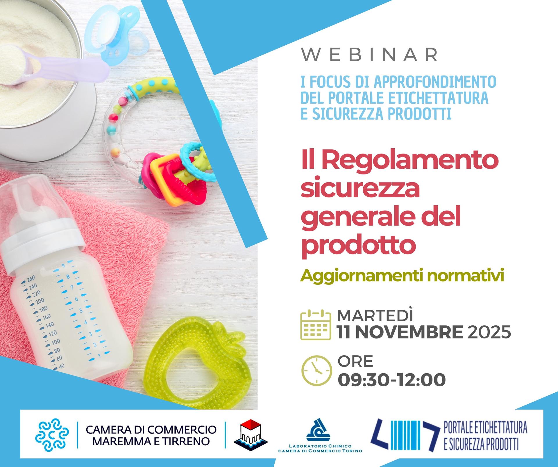 Lo Sportello Etichettatura e Sicurezza Prodotti della Camera di Commercio Maremma e Tirreno propone un webinar nazionale gratuito dedicato al Regolamento sicurezza generale del prodotto, recentemente entrato in vigore. Il seminario formativo online dal titolo Il Regolamento sicurezza generale del prodotto: aggiornamenti normativi è in programma martedì 11 novembre 2025, dalle 09:30 alle 12:00. È rivolto a imprese, consulenti, associazioni di categoria e operatori economici coinvolti nella produzione, distribuzione e vendita di prodotti di consumo e ha l'obiettivo di fornire indicazioni pratiche e supporto per facilitare l’adeguamento alla nuova normativa.