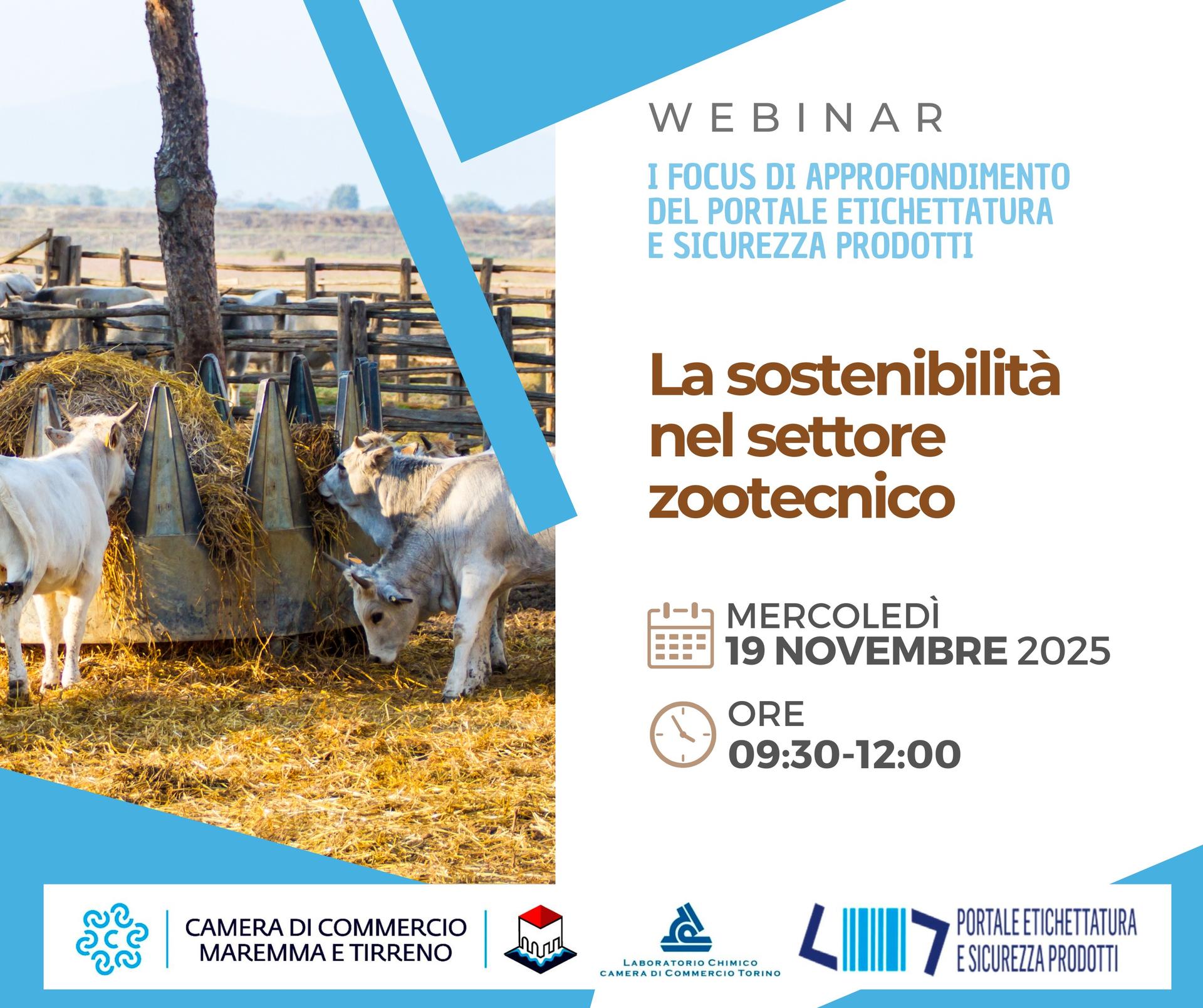 Lo Sportello Etichettatura e Sicurezza Prodotti della Camera di Commercio Maremma e Tirreno propone un webinar nazionale gratuito dedicato al tema della sostenibilità nel settore zootecnico. Il seminario formativo online, gratuito previa iscrizione, si terrà mercoledì 19 novembre 2025, dalle 09:30 alle 12:00. È accreditato dal Consiglio Nazionale dell’Ordine dei Tecnologi Alimentari per 3 crediti formativi e per i dottori Agronomi e dottori Forestali. Durante il webinar verranno analizzati i sistemi di sostenibilità applicabili alla zootecnia, con un focus sugli schemi di certificazione: Sistema Qualità Nazionale per il Benessere Animale, certificazione biologica e altri schemi di certificazione in ambito zootecnico.